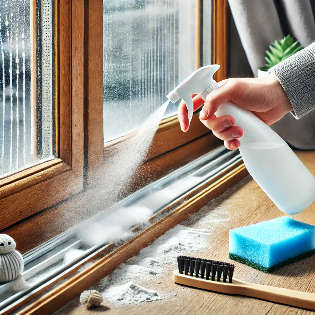 - 얼룩이 있는 창틀 표면에 천연 세제를 골고루 뿌리고 약 10분간 방치합니다.
