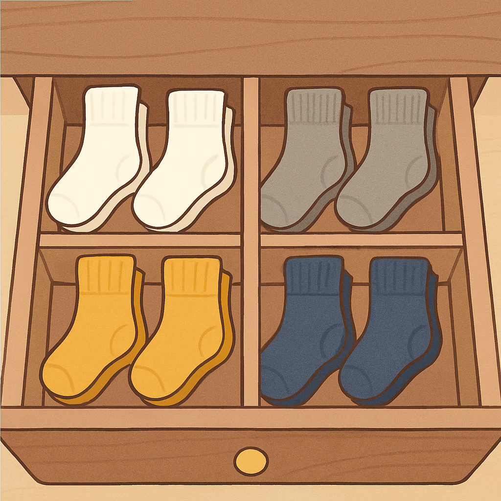 아이들의 양말을 분류하고 정리하는 과정을 ‘게임’처럼 만들어보는 것도 효과적입니다. 색깔 맞추기, 시간 내 짝 맞추기 등 놀이 요소를 더하면 정리 습관을 자연스럽게 익힐 수 있습니다.