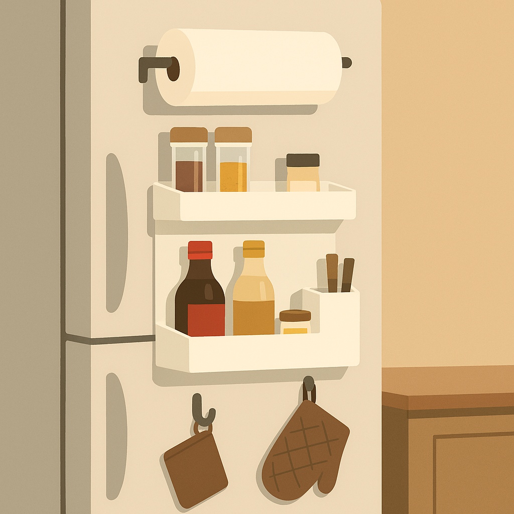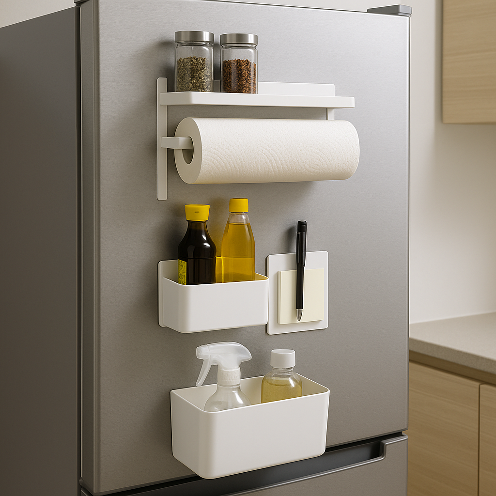 냉장고 측면은 자석이 잘 붙는 평평한 철판 구조로 되어 있어 다양한 자석형 수납함을 부착하기에 최적화된 공간입니다. 특히 좁은 주방에서는 벽에 선반을 달기보다, 냉장고 측면을 활용하는 것이 간편하고 흔적도 남지 않아 매우 실용적입니다.
