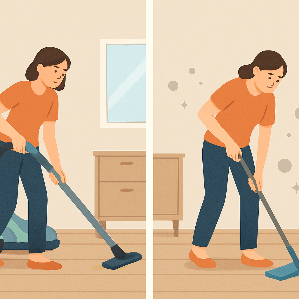 물걸레 청소는 표면 오염 제거에 효과적이지만, 공기 중이나 가구 아래에 숨어 있는 먼지를 먼저 제거하지 않으면