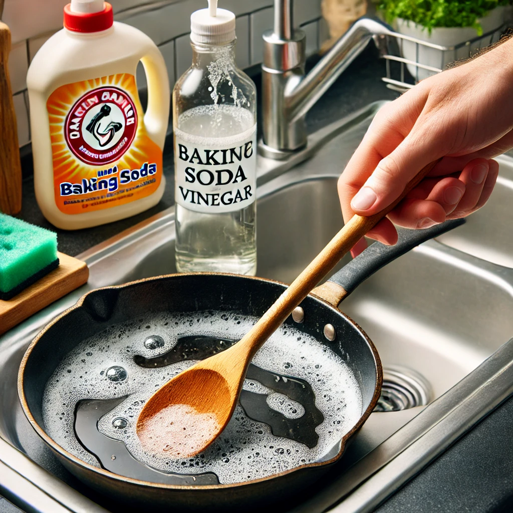 - 베이킹소다 뿌리기 프라이팬이 미지근한 상태에서 베이킹소다를 충분히 뿌립니다. 베이킹소다는 기름때를 분해하는 데 효과적이며, 환경에도 무해한 천연 세제 역할을 합니다.