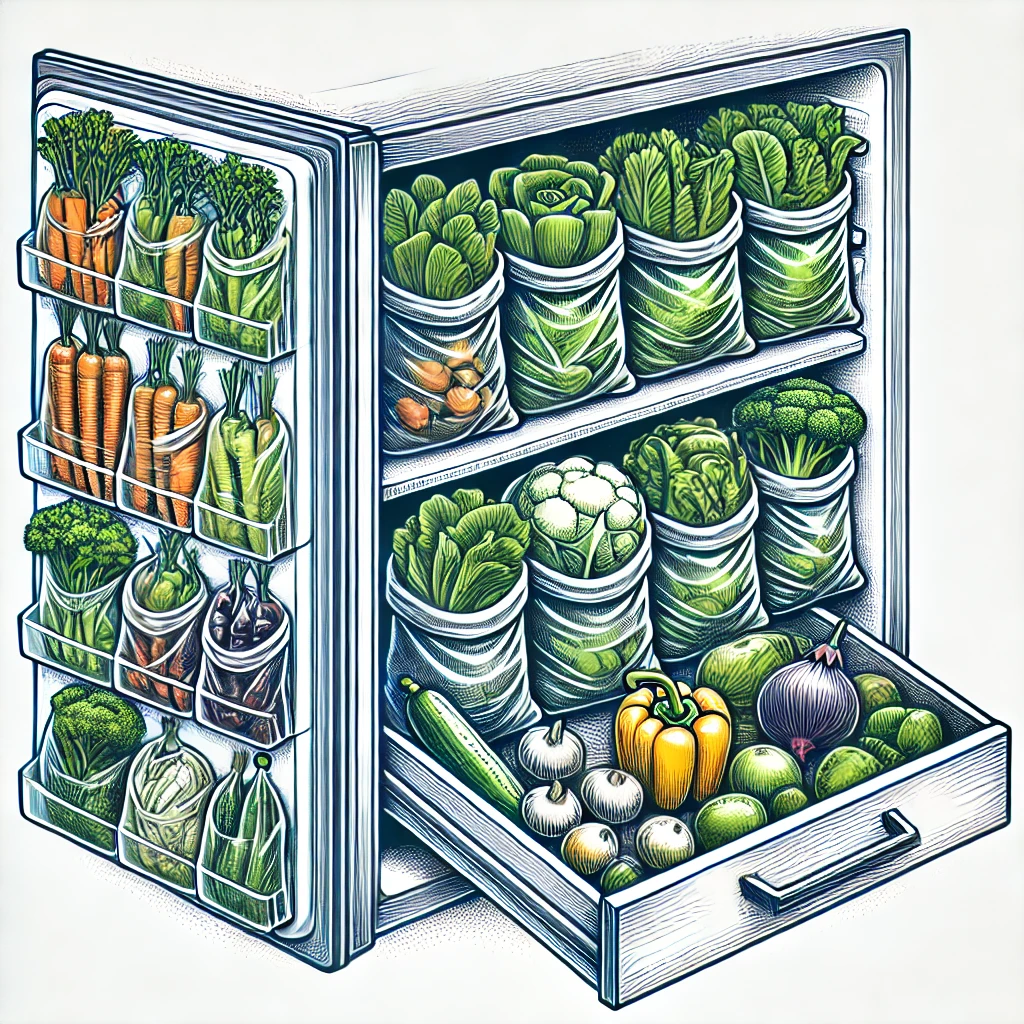 [이미지: 냉장고 속 채소 보관 칸을 정리한 모습]