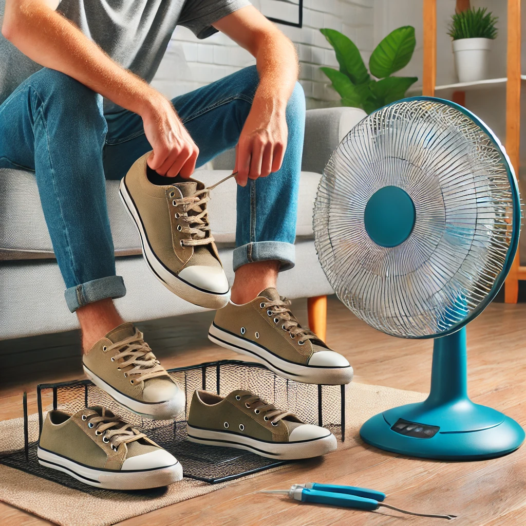 - 신발을 선풍기나 서큘레이터 앞에 두고 바람이 신발 속으로 들어가도록 위치를 조정합니다.