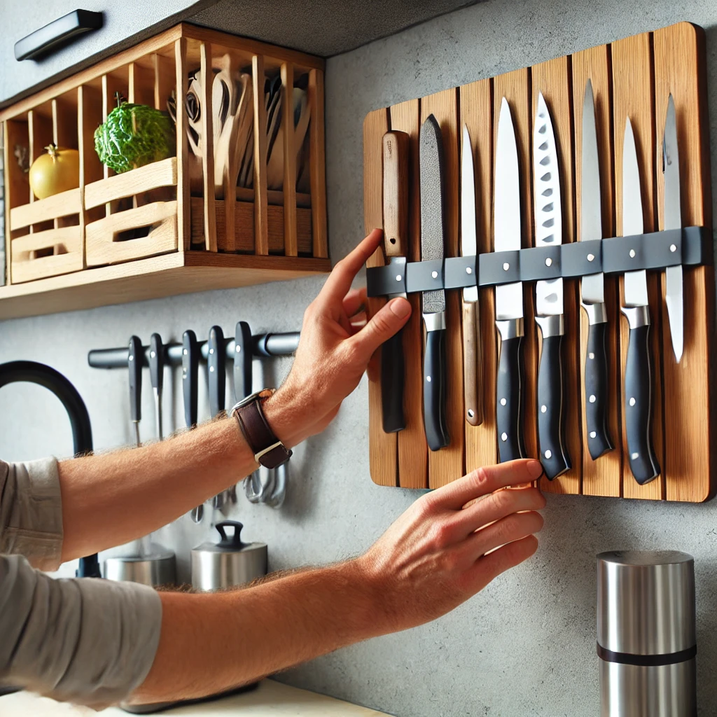 - 주방 벽에 설치하는 마그네틱 칼 거치대는 공간을 절약하면서도 칼을 쉽게 보관할 수 있는 방법이다.