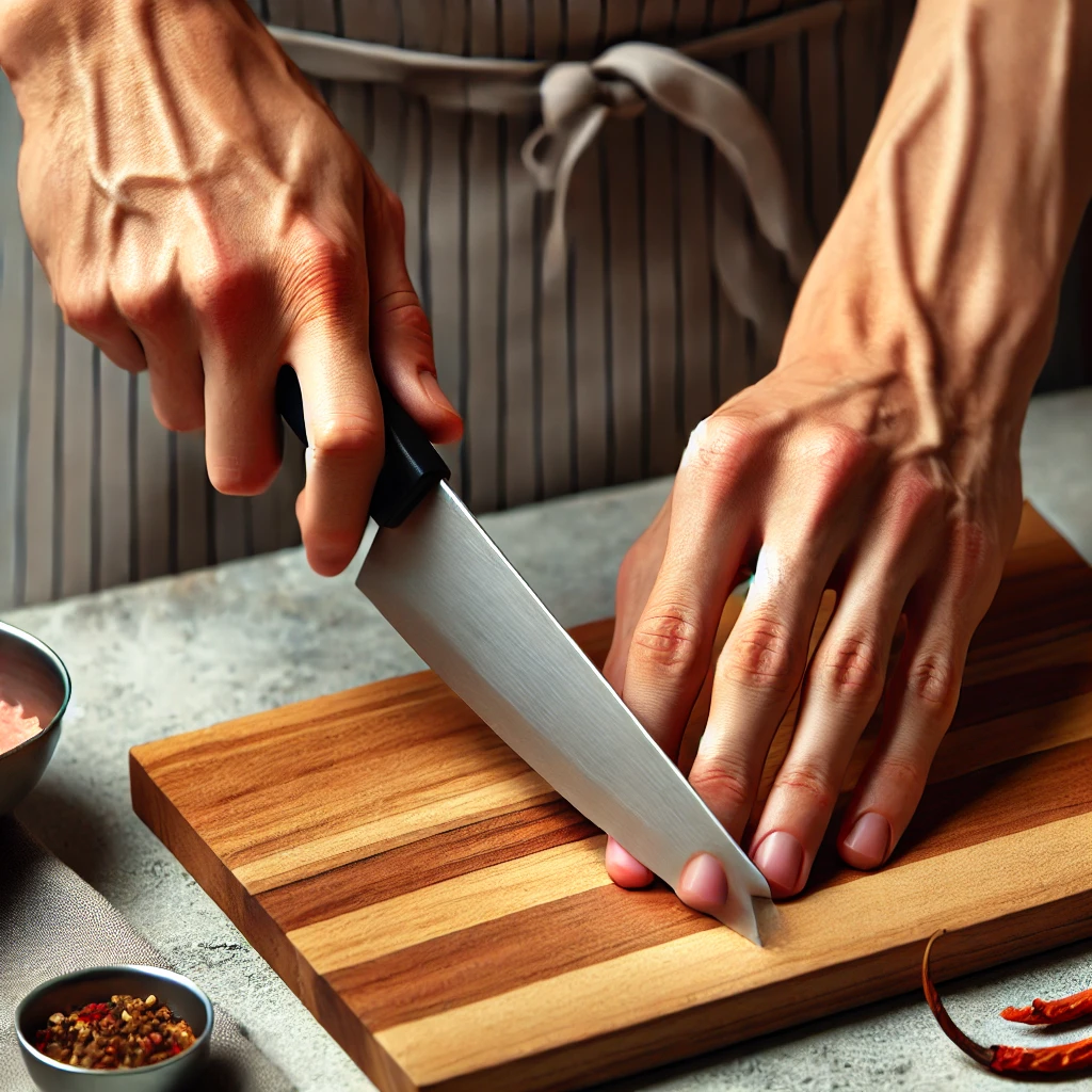 칼을 사용할 때는 손을 보호하면서도 효율적으로 자를 수 있도록 적절한 기술이 필요하다.