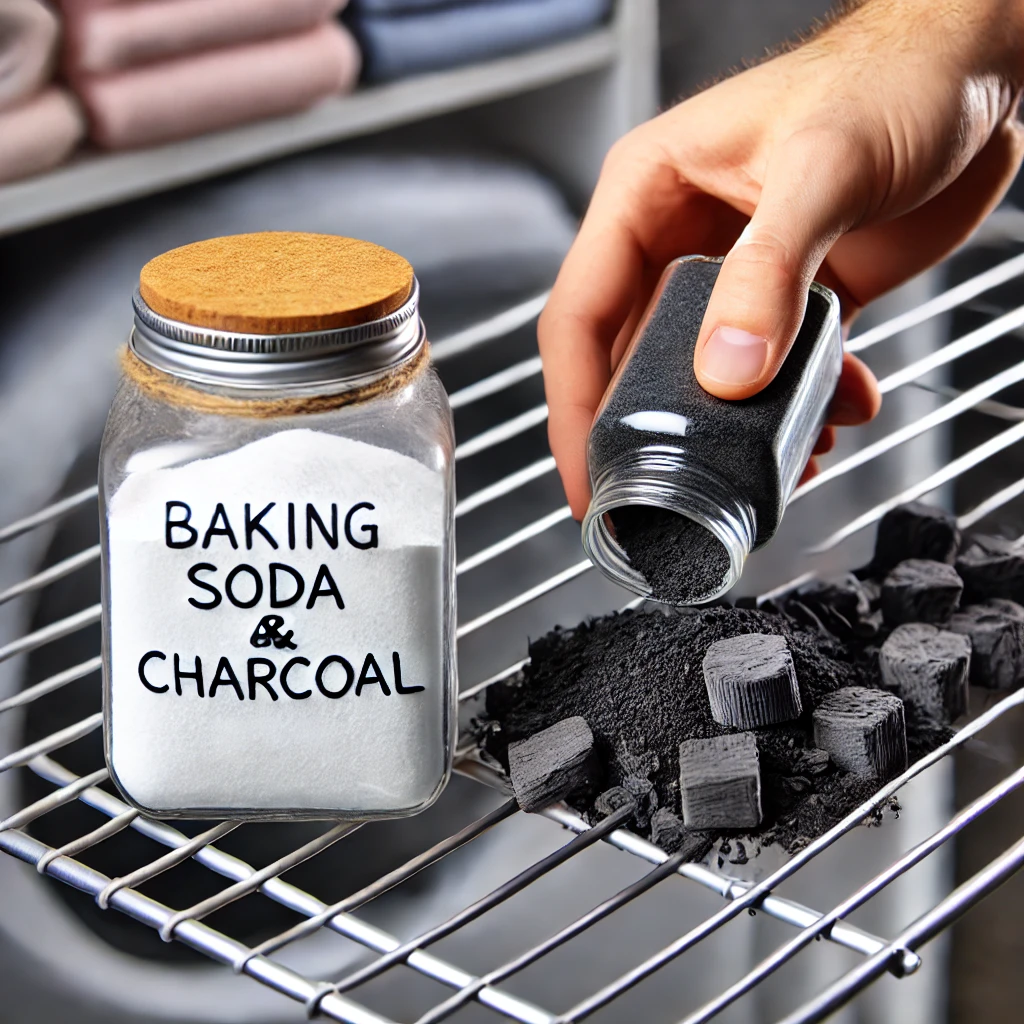- 숯이나 베이킹소다를 작은 그릇에 담아 빨래 근처에 두면 습기를 빨아들이고 탈취 효과도 있습니다.